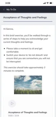 La pratique indépendante d’activités ACT telles que celles-ci peut être facilitée à l’aide d’outils numériques de soins mixtes tels que Quenza (photo ici), grâce auquel les thérapeutes peuvent concevoir et partager les activités sous forme écrite ou audio.
