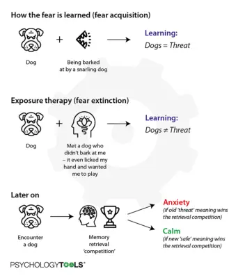 L'extinction de la peur est le type d'apprentissage qui se produit pendant la thérapie d'exposition. L'extinction est une forme d'apprentissage associatif. Au cours d'une thérapie d'exposition, une personne est confrontée à plusieurs reprises à un stimulus induisant la peur (stimulus conditionné : CS) sans que la terrible conséquence (stimulus inconditionné : US) ne se produise. Par conséquent:
