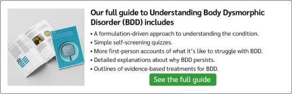 De nombreuses personnes s'inquiètent de leur apparence, mais si s'inquiéter de leur apparence devient très pénible ou si vous ne pouvez pas arrêter d'y penser, vous souffrez peut-être d'un trouble dysmorphique corporel (BDD). C’est un problème assez courant : les recherches suggèrent qu’entre 1 et 3 personnes sur 100 en souffrent [1]. Heureusement, des traitements efficaces ont été développés pour le BDD, notamment la thérapie cognitivo-comportementale (TCC).