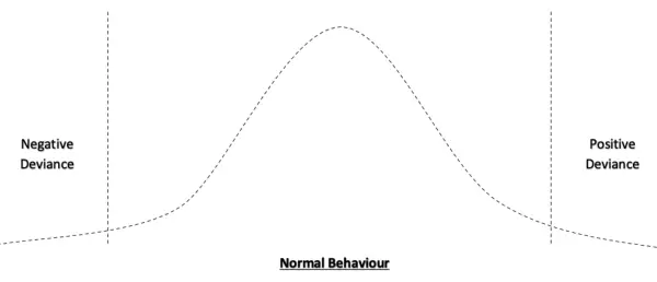 Le approche statistique recherche un comportement différent de la majorité. L'action, lorsqu'elle est exprimée sous forme de courbe en cloche, identifie les individus déviants aux extrémités de la distribution normale, comme représenté ci-dessous (modifié de Spreitzer