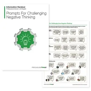 La restructuration cognitive est une intervention fondée sur des données probantes qui consiste à identifier, évaluer et modifier les cognitions inadaptées, y compris les pensées automatiques négatives (NAT). Le Invites pour remettre en question vos pensées négatives Le document d'information est conçu pour guider les clients tout au long du processus d'évaluation des pensées automatiques négatives. Il présente des questions qui aident les clients à déterminer si leurs pensées négatives sont exactes, utiles, objectives et correspondent à la « vision d’ensemble ».