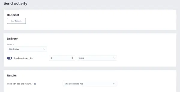 Le thérapeute sélectionne le destinataire, choisit quand l'envoyer, s'il y aura un rappel de suivi et qui peut voir la feuille de travail complétée.