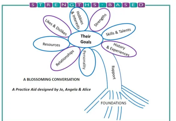 Une évaluation des points forts commence par une conversation florissante qui doit être aussi naturelle que possible. Il ne doit pas être structuré autour de critères d’éligibilité aux services, même si ceux-ci seront abordés plus tard. Une carte mentale visuelle de la conversation florissante est reproduite ci-dessous.