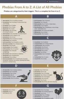 La liste ci-dessus est longue, mais bon nombre de ces phobies sont rares, en particulier les plus obscures. Un examen des types de phobies les plus courants peut être plus utile.