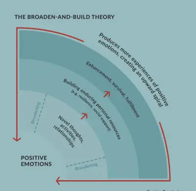 …ces émotions positives élargissent le répertoire pensée-action momentané d’un individu : la joie suscite l’envie de jouer, l’intérêt suscite l’envie d’explorer, le contentement suscite l’envie de savourer et d’intégrer, et l’amour déclenche un cycle récurrent de chacune de ces pulsions au sein de relations sûres et étroites.