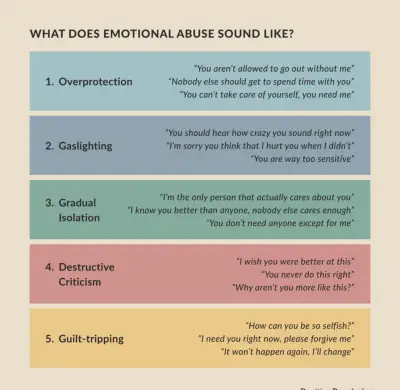 Abus émotionnelLorsqu’on parle de violence domestique, ce qui vient en premier à l’esprit est la violence physique ou sexuelle. La recherche, les ressources et les lignes d'assistance téléphonique se concentrent principalement sur ces formes d'abus.